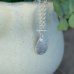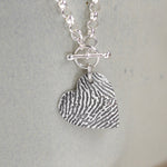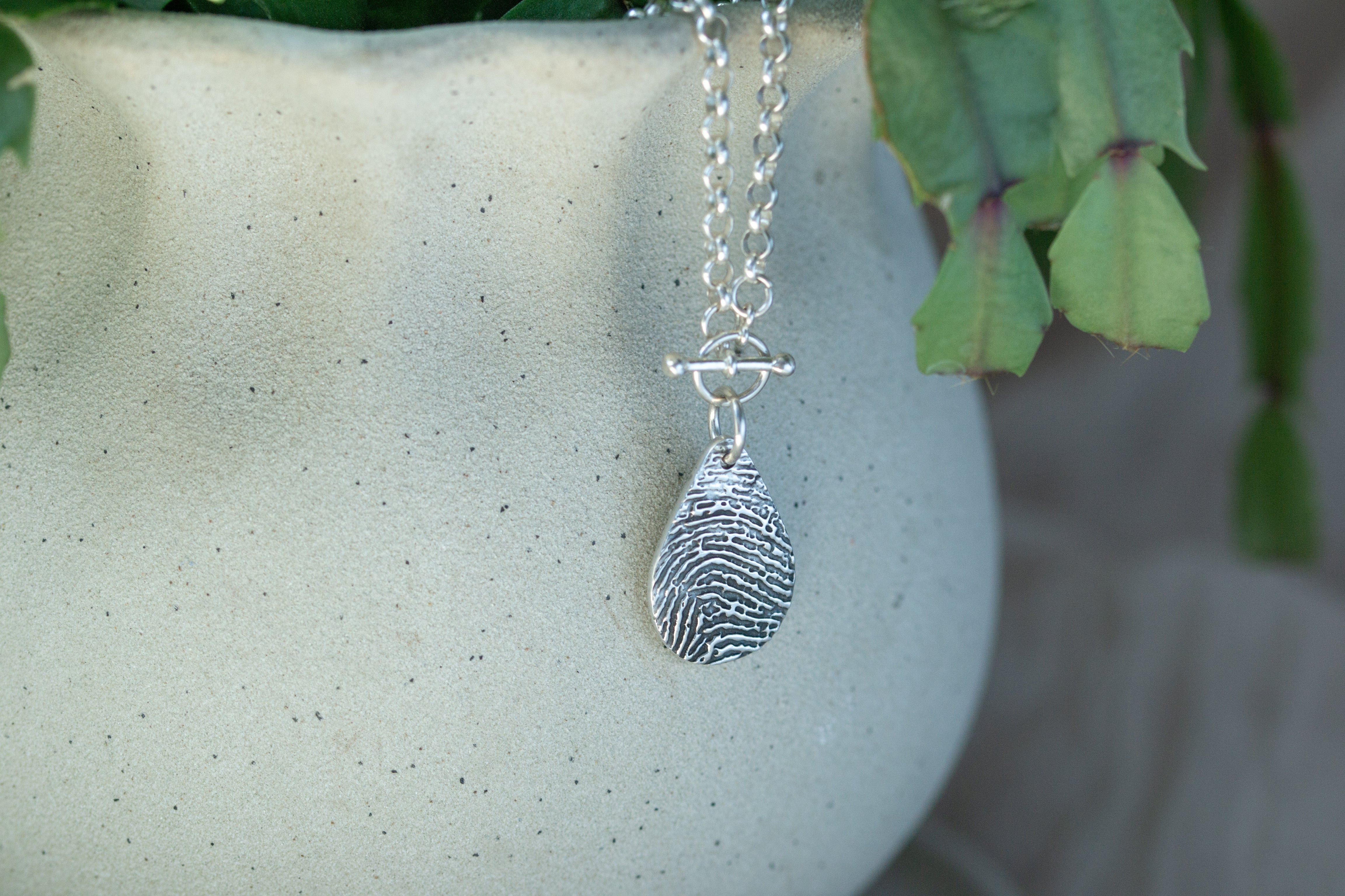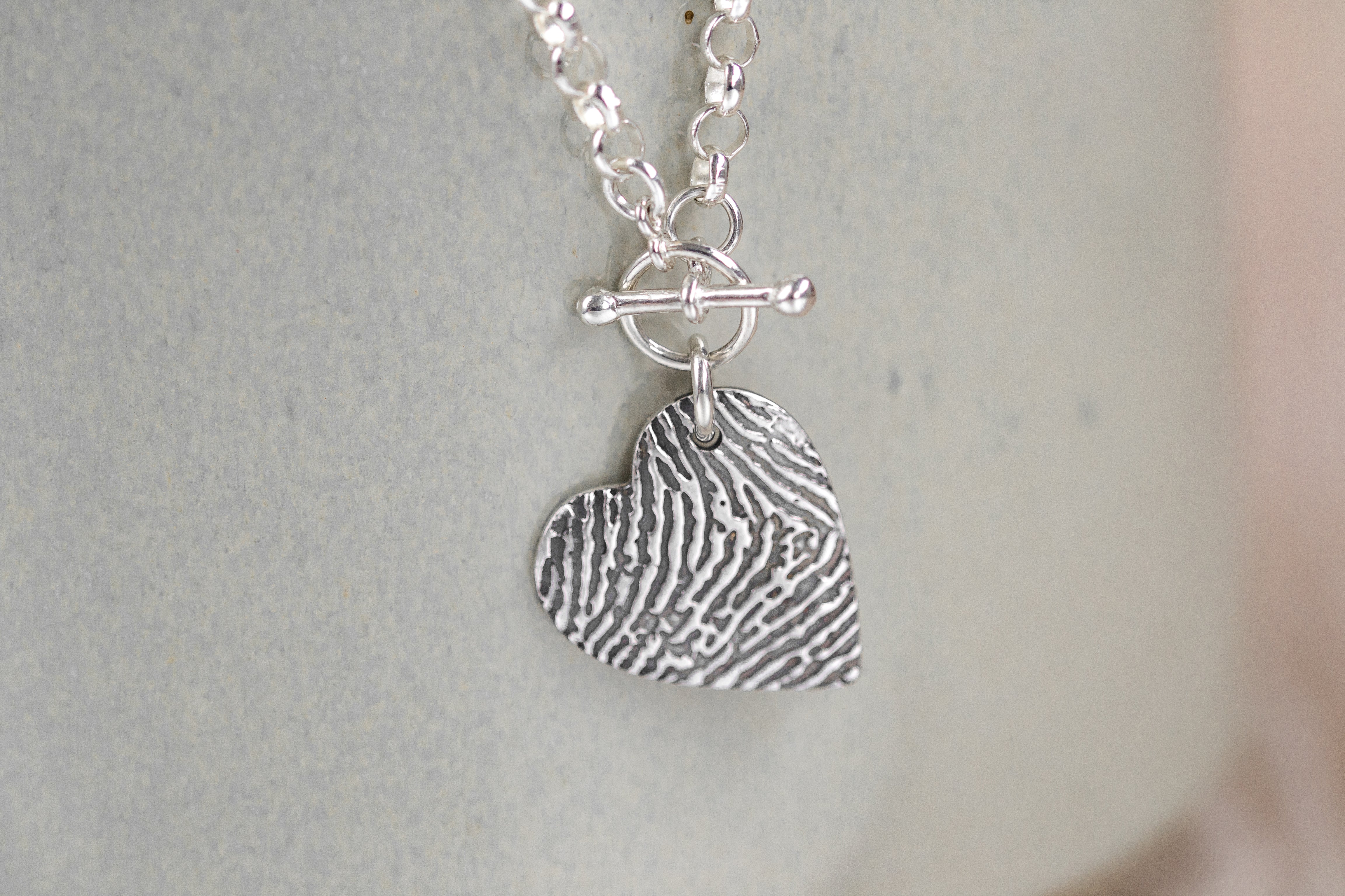 Introducing our chunkiest fingerprint jewellery chain, available in three sizes and crafted in Italy for a luxurious touch. This bold chain features a modern T and O bar clasp, combining style with substance. Feel the intricate texture of an actual fingerprint, beautifully embellished on a sterling silver pendant—a truly personal and meaningful keepsake. If you already have an ink print, simply upload it with your order, or choose one of our ink print kits to send your print later. Select from a variety of pendant shapes, each with the option to be engraved with a name and age, adding a personalised touch to your fingerprint jewellery.