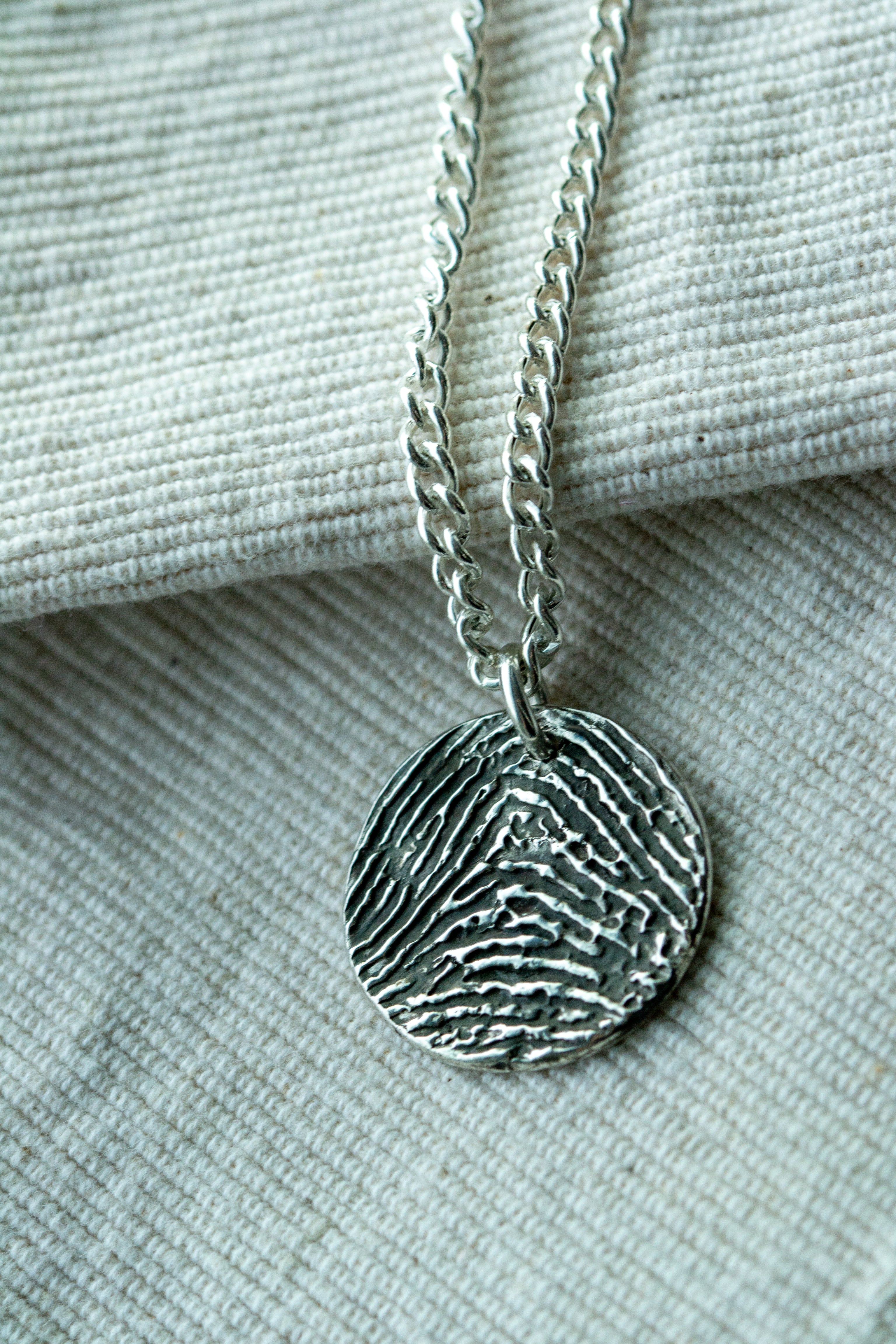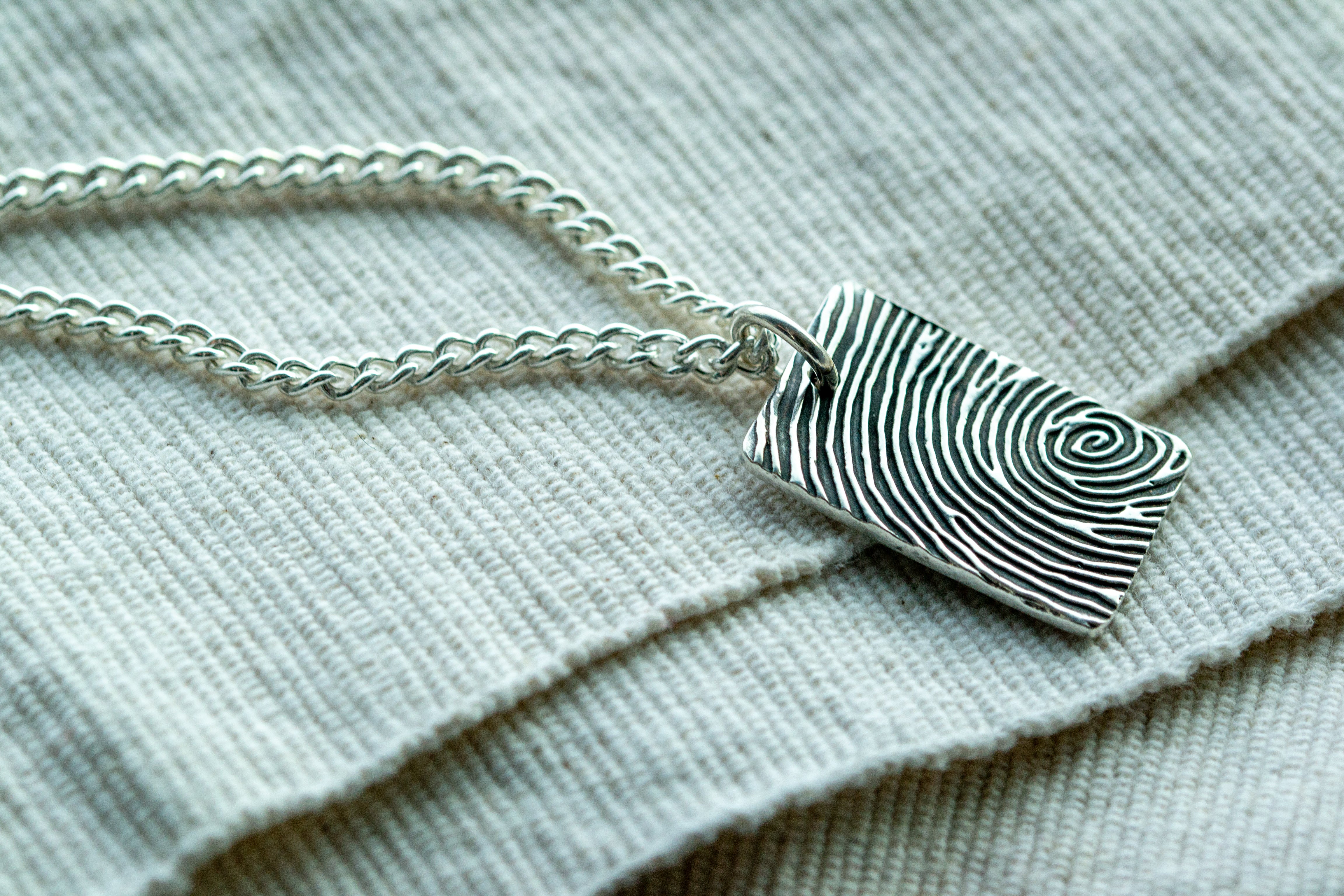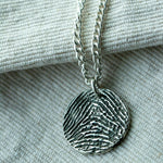 Prefer a longer, elegant chain to showcase your unique fingerprint jewellery? This sterling silver pendant beautifully captures the texture of an actual fingerprint, making it a meaningful keepsake not just for a child’s print but also for keeping a grown-up loved one close. If you have an existing ink print, simply upload it with your order, or include one of our ink print kits to send us your print later. Select from a variety of pendant shapes, each with the option to be engraved with a name and age. Complete your piece with one of our Italian-made, slinky sterling silver curb chains, available in two sizes. To make it even more special, you can add the birthstone of your choice. Perfect for creating a truly personalised piece of fingerprint jewellery.
