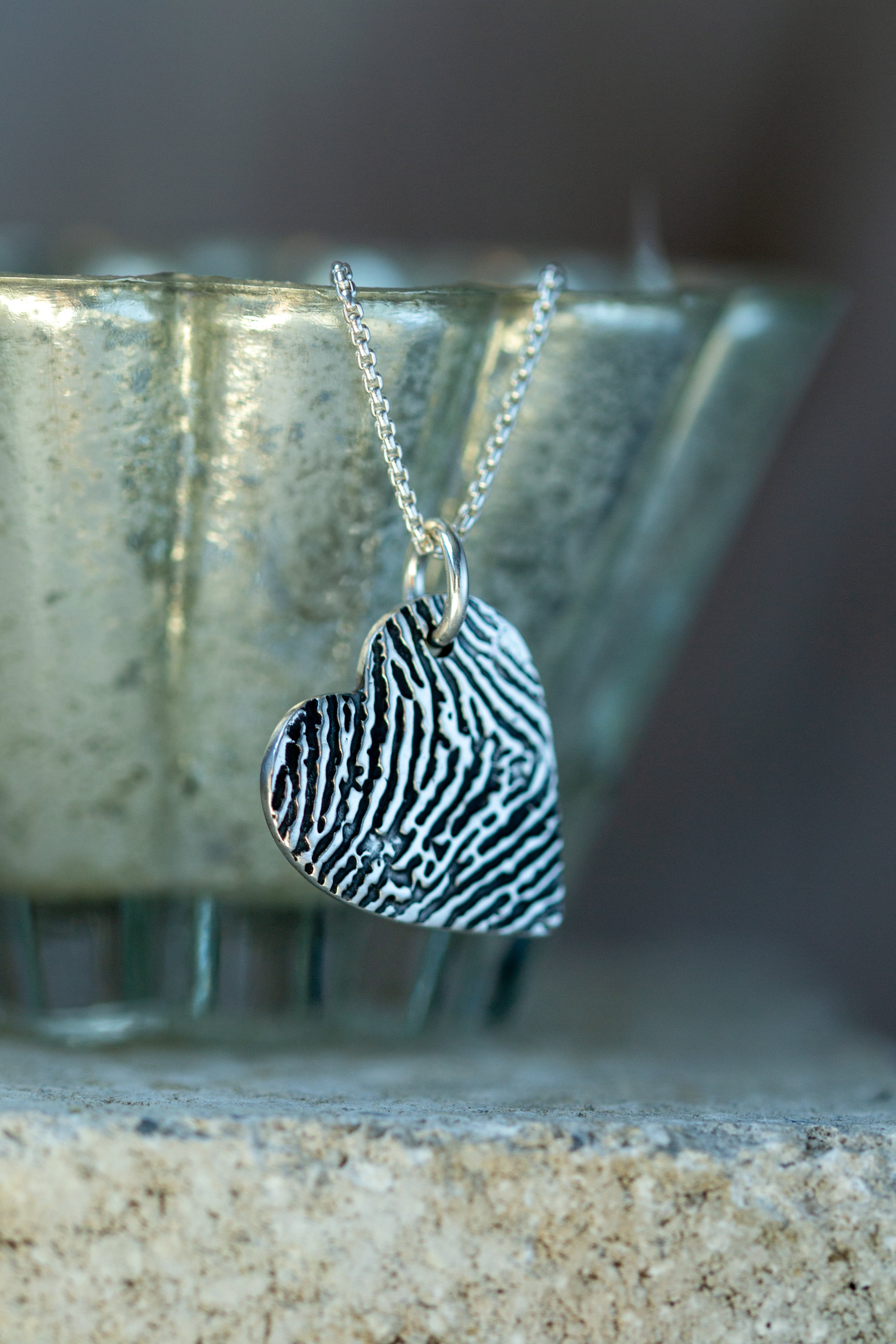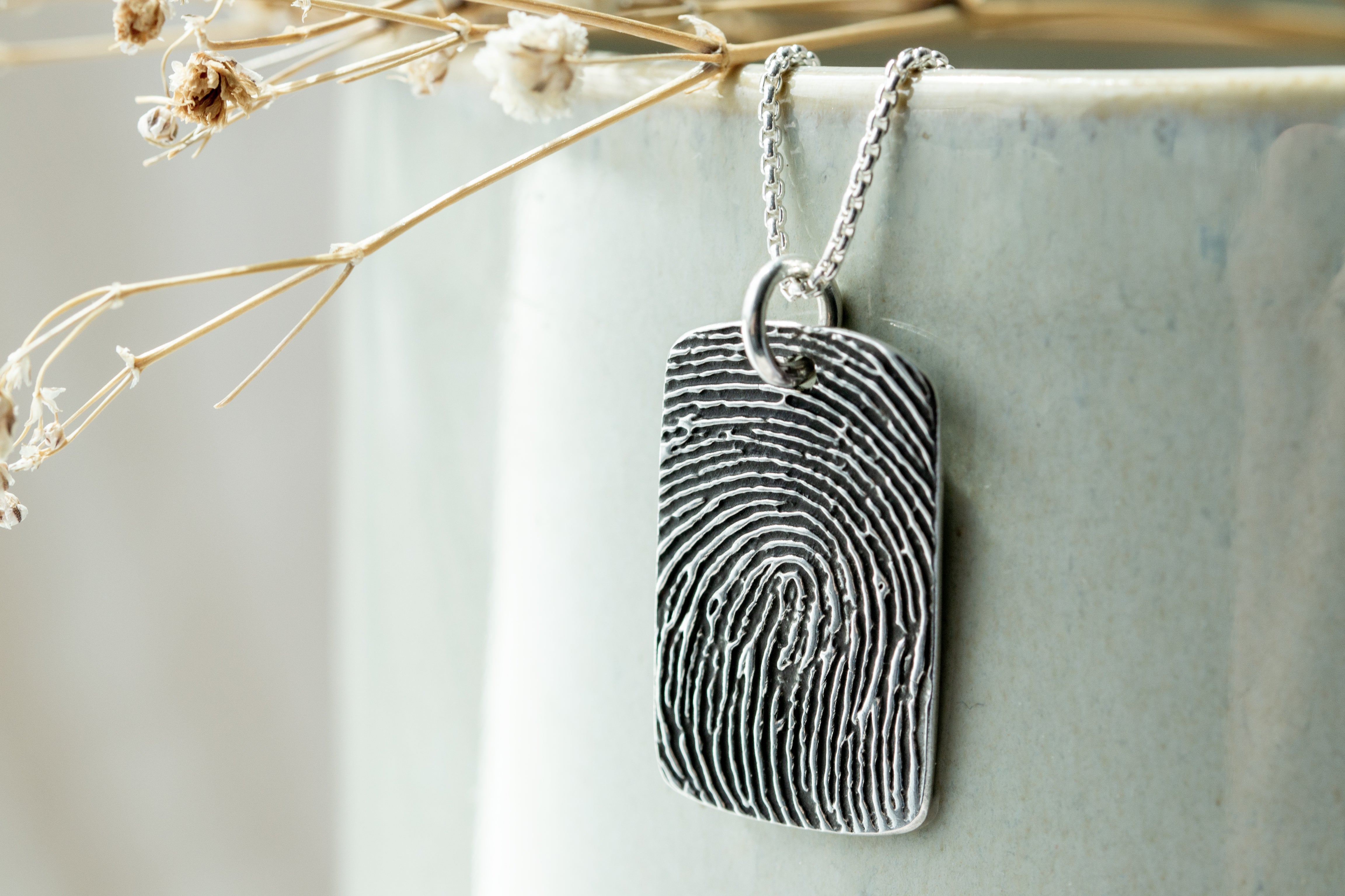 Enhance your necklace with our Italian-made sterling silver fine link chains, available in three sizes. Perfect for showcasing a unique keepsake, these delicate chains are crafted to complement our fingerprint jewellery. Feel the distinct texture of a real fingerprint, intricately detailed on a sterling silver pendant, ideal for preserving the print of a child or a cherished adult. Keep your loved ones close with this personalised piece. You can easily upload an existing ink print with your order, or opt for our ink print kit to send it later. Choose from various pendant shapes, each offering the option to be engraved with a name and age, adding an extra layer of personalization to your fingerprint jewellery.