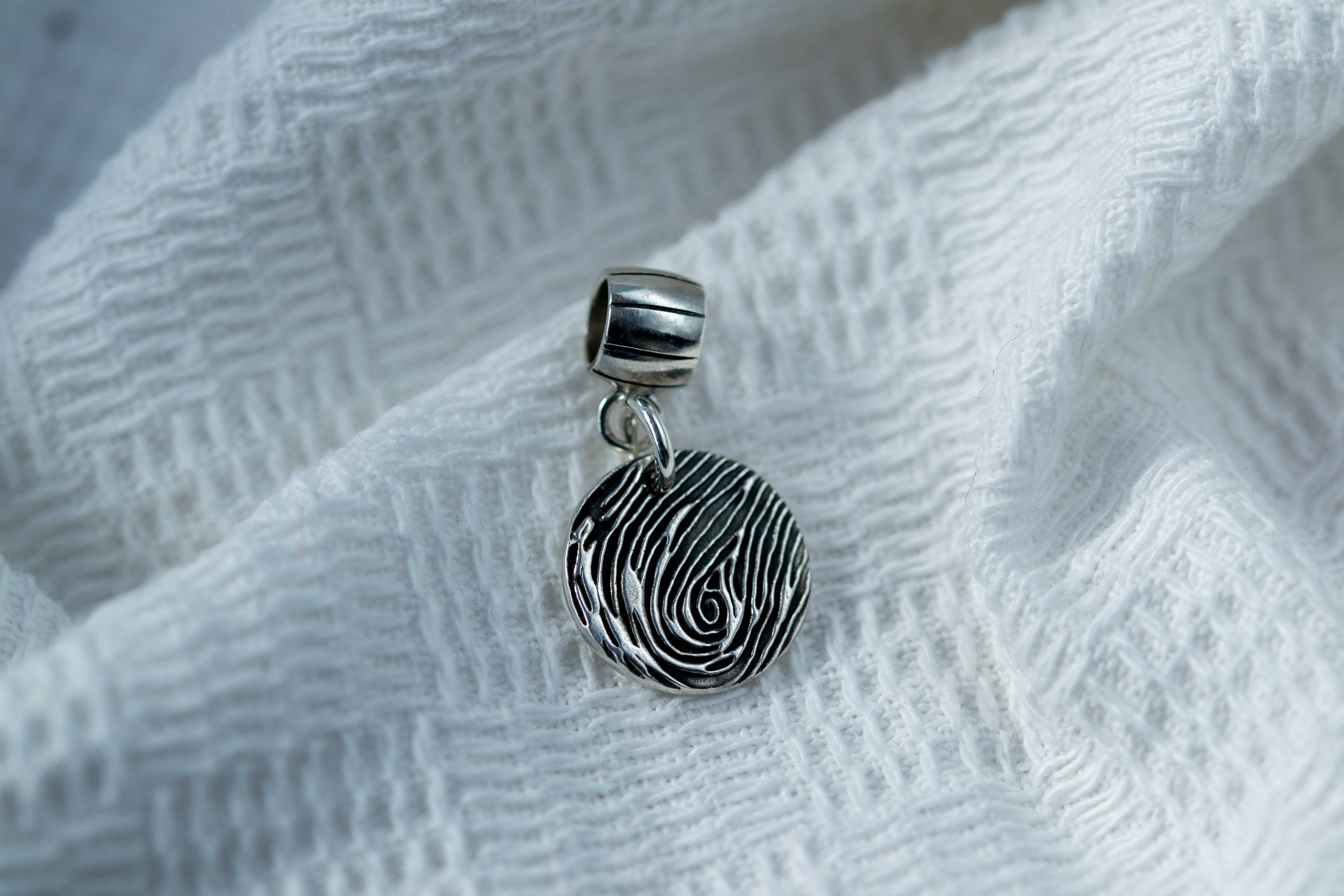 Make your Pandora bracelet truly personal with our memorial fingerprint jewellery charm. Crafted in sterling silver and featuring a Pandora-compatible carrier, this charm captures the unique texture of a loved one’s fingerprint. Upload an existing ink print or add an ink kit to create your keepsake. Available in various shapes, each charm includes a name and age engraving on the back at no extra cost. This meaningful charm is a beautiful way to honor a loved one’s memory.