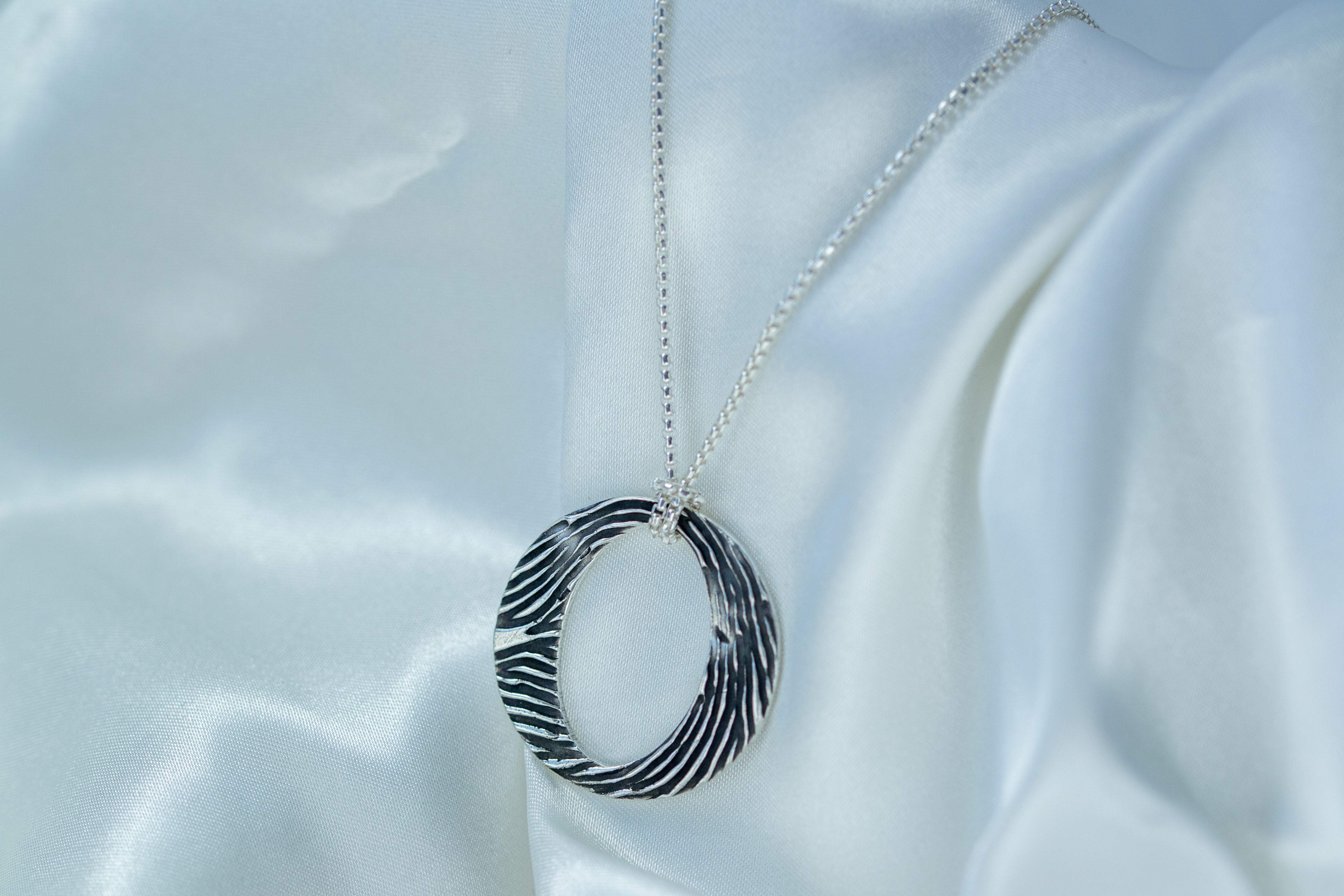 Celebrate your love with our stunning memorial fingerprint jewellery, designed to honor the memory of a loved one. This sterling silver pendant beautifully captures the texture of a fingerprint, creating a deeply personal keepsake. Simply upload an existing ink print with your order, or choose one of our ink print kits to send your print later. Complete your piece with one of our Italian-made sterling silver necklaces, available in various sizes, to create a truly unique and meaningful memorial jewellery piece.