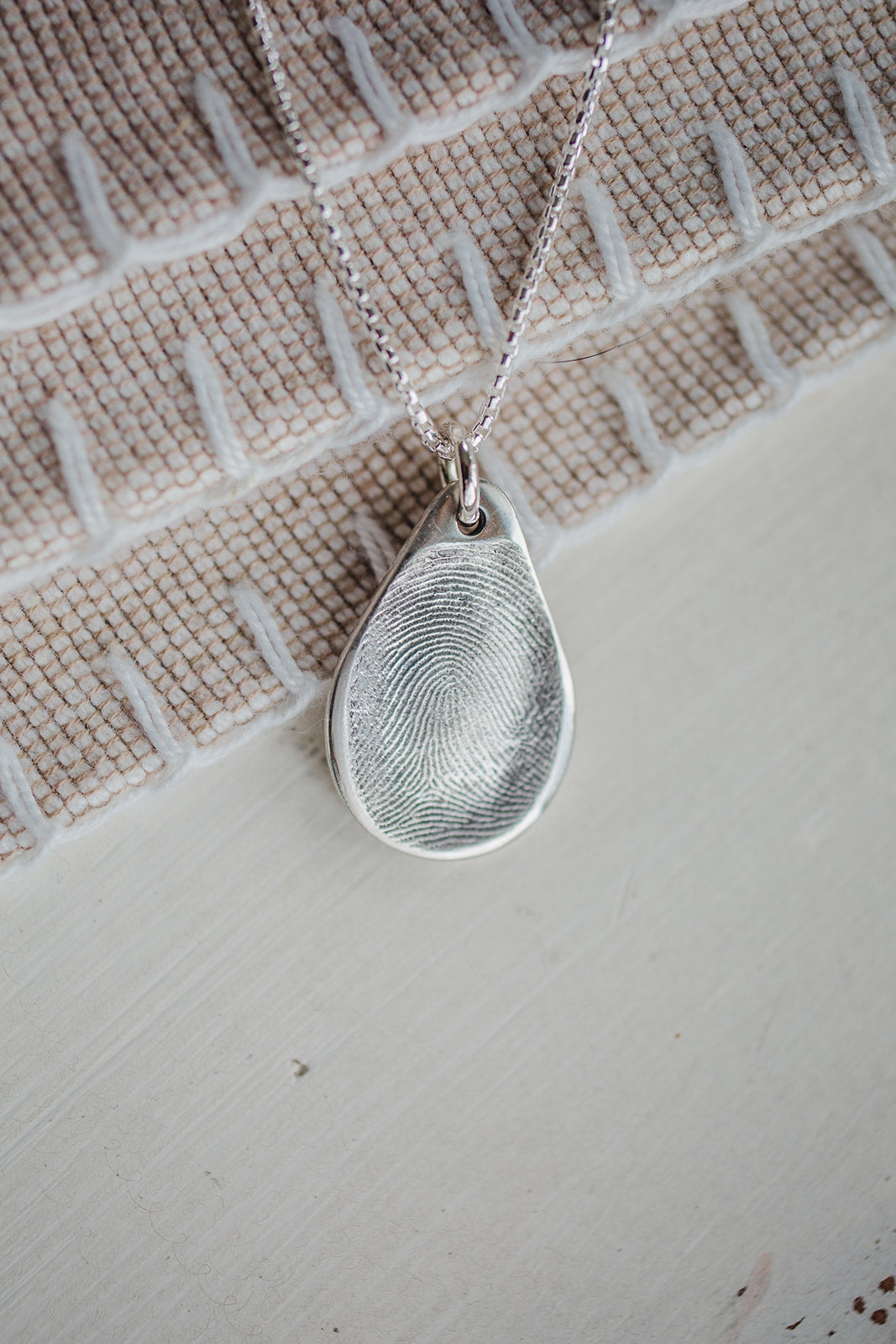 Our most popular necklace for showcasing your unique fingerprint jewellery, featuring your love one's actual fingerprint captured in sterling silver—perfect for adults too! Visit a local jeweller for an impression or use our included moulding kit to create the perfect pendant at home. Choose from various shapes, with a hand-engraved name and age included. Complete your piece with one of our Italian-made, sterling silver link chains, available in three sizes, and optionally add a birthstone for a truly personalised touch.