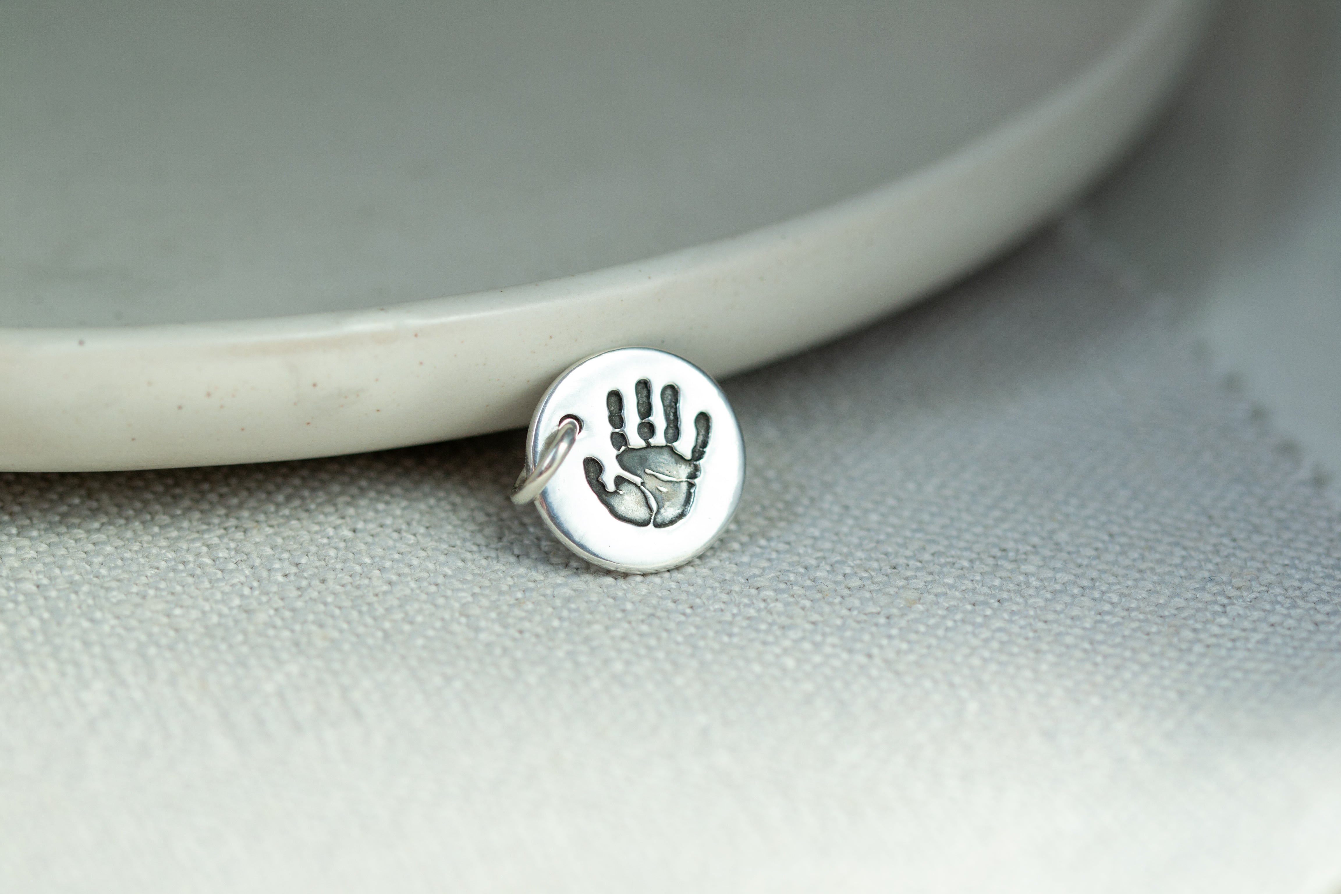 The perfect addition to your charm collection! This popular sterling silver charm captures a hand or footprint on one side, with a name and age engraved on the reverse. As a standout piece of hand and footprint jewellery, each charm is handmade and comes with a silver jump ring, making it easy to attach to an existing bracelet or necklace. Upload a clear picture of an existing print or clay cast with your order, or use one of our inkless hand & footprint kits to create a new print. Choose from various charm shapes, and your finished item will arrive beautifully packaged, complete with a polishing cloth and care advice.