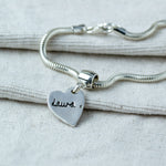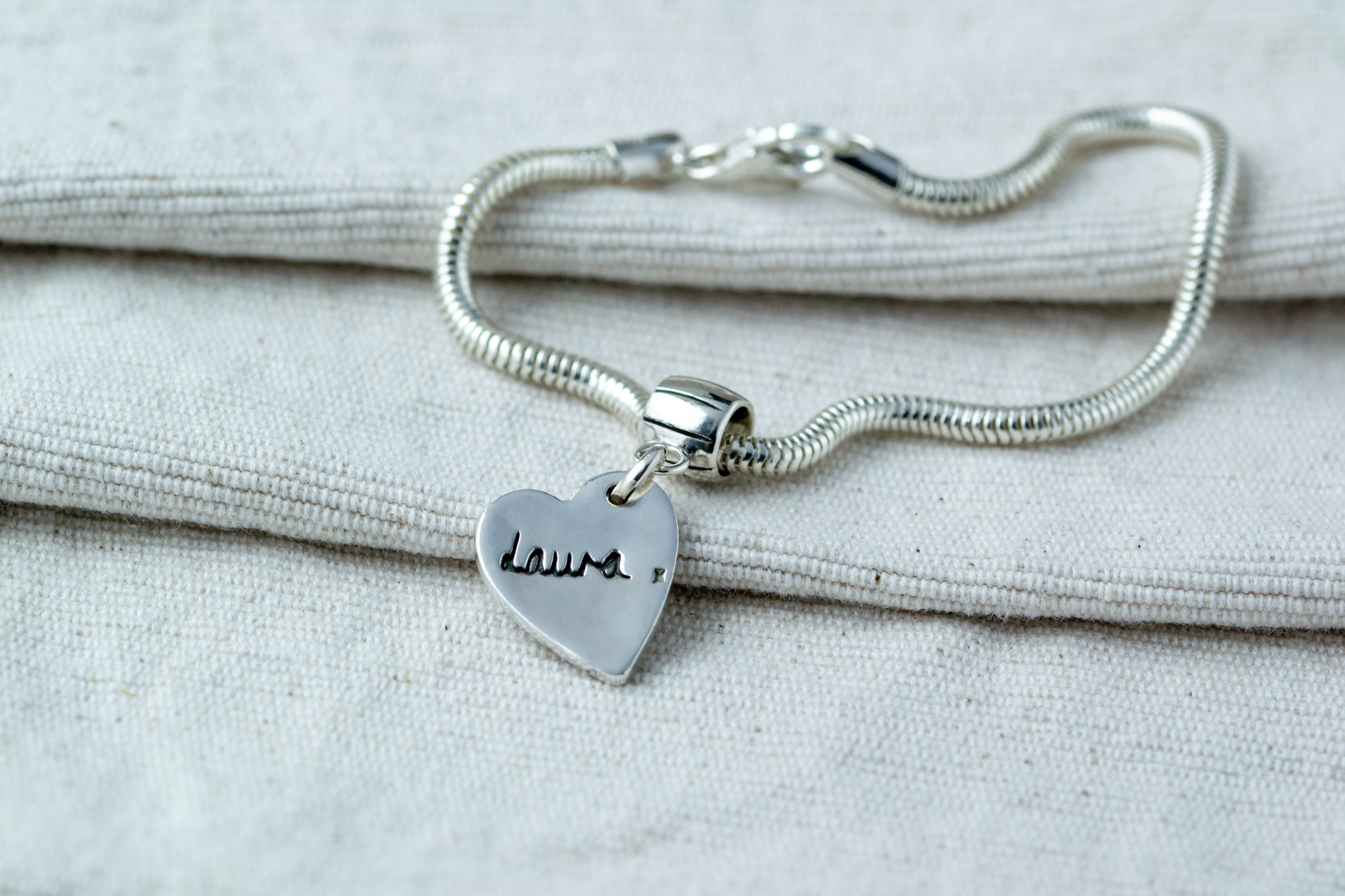 Capture original handwritten names or words with our sterling silver charm, and showcase it on a silky snake chain bracelet. This charm attaches to the bracelet using a sterling silver carrier that is Pandora-compatible. To personalise your charm, simply take a photo of the handwriting and upload the image with your order. Choose from a variety of charm shapes, and enjoy complimentary engraving of a name and age on the back—all included in the price. Elevate your style with this unique piece of handwriting jewellery!