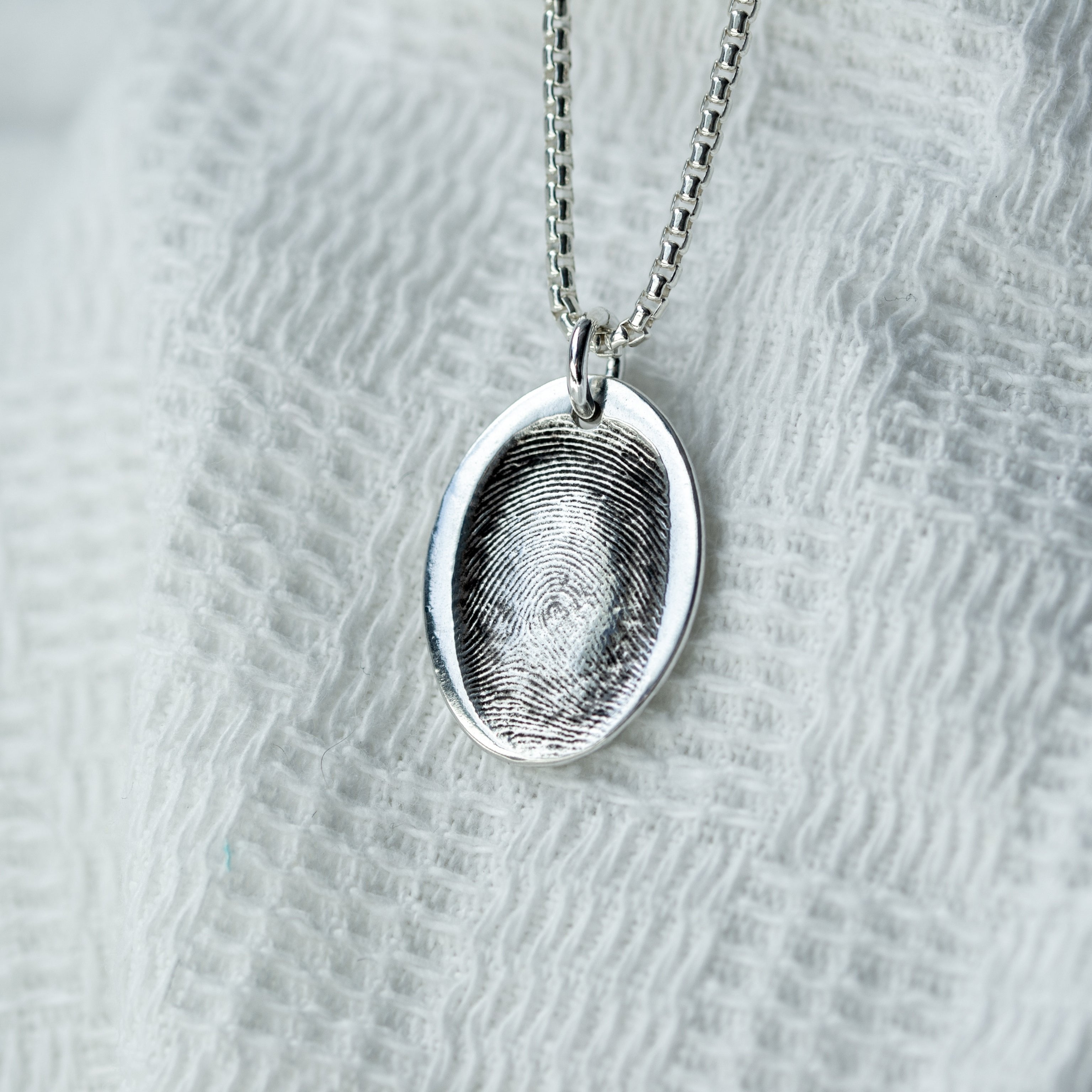 For those who prefer a classic necklace with a bit more substance, our memorial fingerprint jewellery is the perfect choice—ideal for honoring cherished memories. Capture a loved one’s actual fingerprint in sterling silver, creating a meaningful keepsake. You can visit a local jeweller for the impression or include our moulding kit with your order. Select from various pendant shapes, with a hand-engraved name and age included. Complete the look with a silver link chain in one of three sizes.